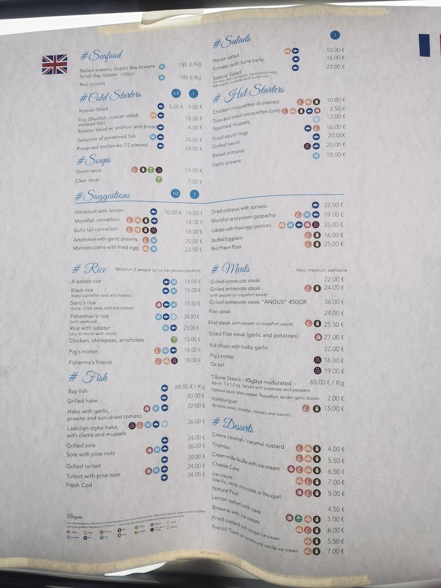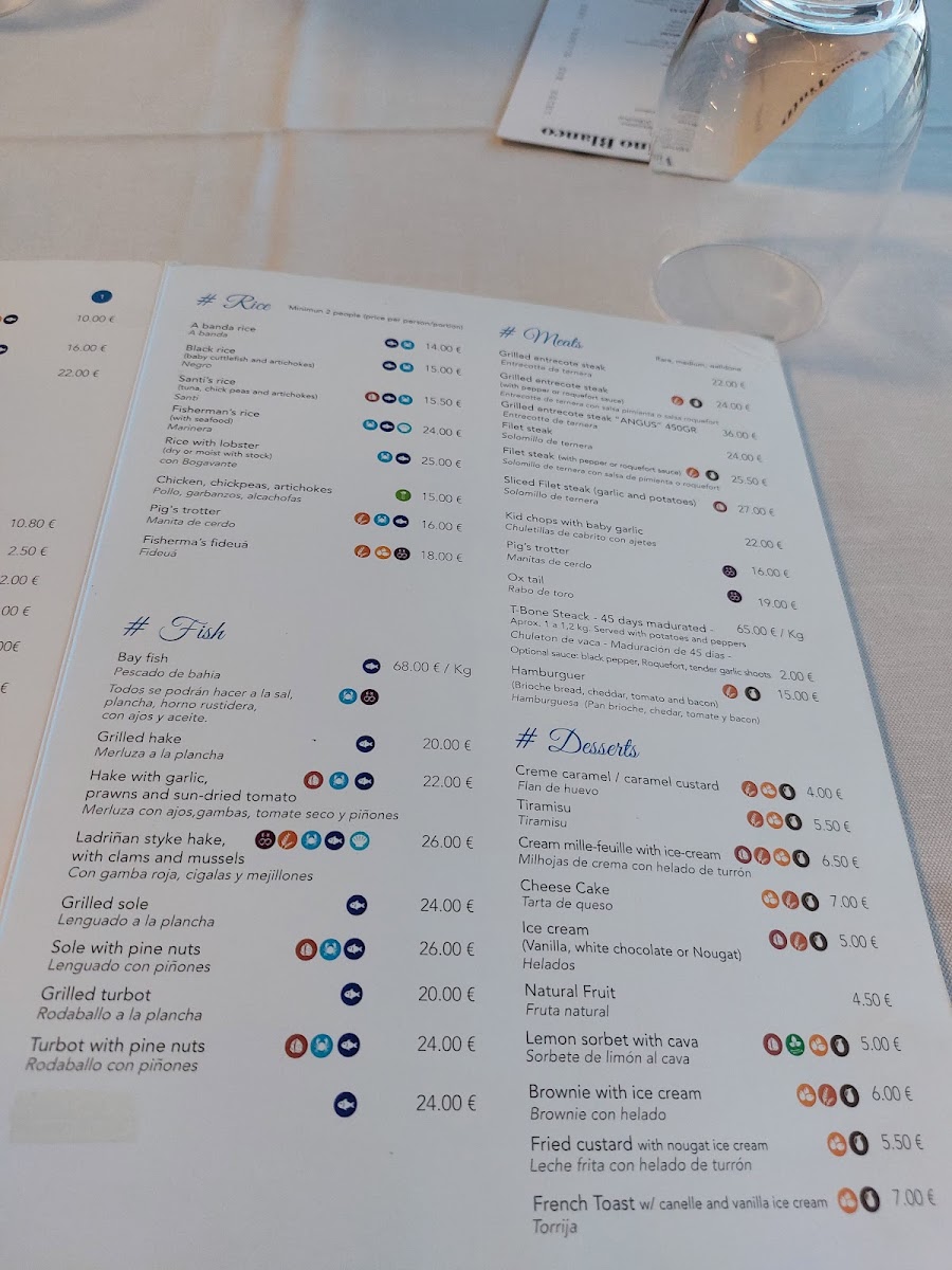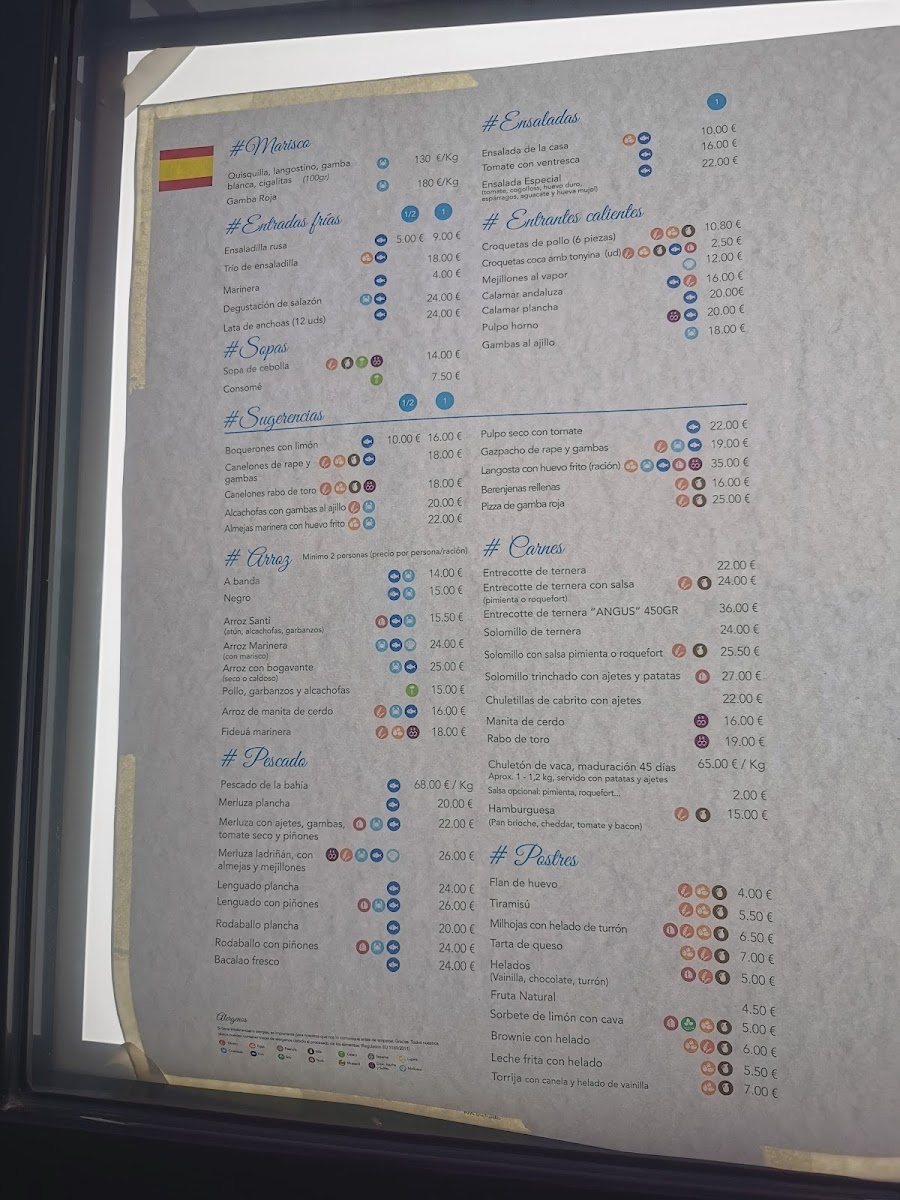 Appetizers serve as light starters, often highlighting local seafood and classic Mediterranean preparations. Main courses primarily emphasize fresh fish and seafood dishes, complemented by some meat options such as solomillo. Sides include typical Mediterranean accompaniments like potatoes and eggs. Desserts feature traditional sweet options from the region.