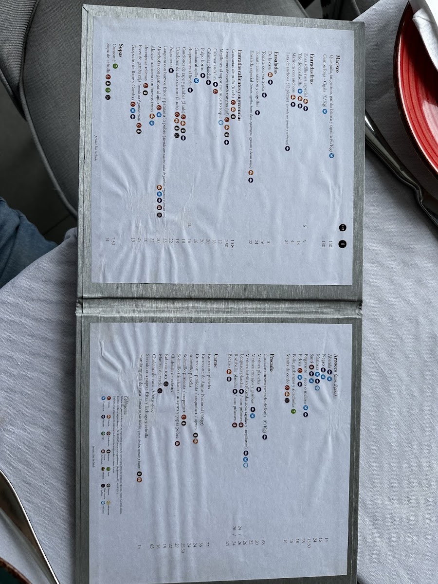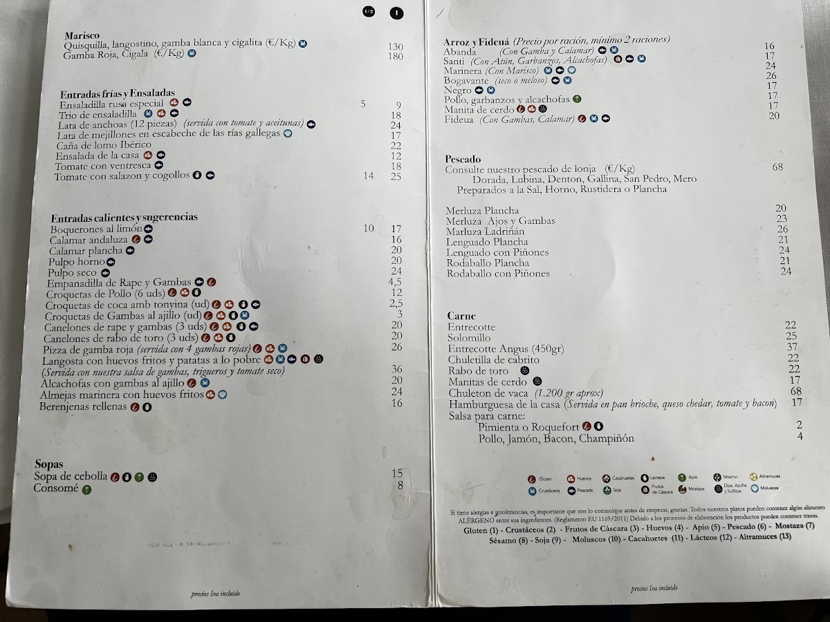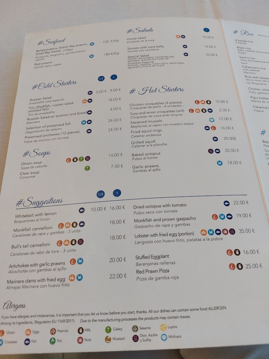 Appetizers serve as light starters, often highlighting local seafood and classic Mediterranean preparations. Main courses primarily emphasize fresh fish and seafood dishes, complemented by some meat options such as solomillo. Sides include typical Mediterranean accompaniments like potatoes and eggs. Desserts feature traditional sweet options from the region.